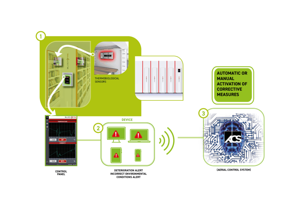 The system is equipped with ACS software. Software specifically developed by Makros to monitor the degradation status of conserved products and automatically activate corrective measures when fungal contaminations arise.